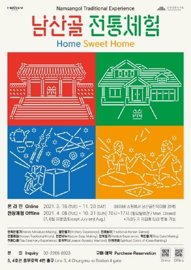 올해 ‘남산골 전통체험’은 ‘HOME SWEET HOME’이라는 콘셉트를 가지고, 집에서 남산골한옥마을의 집(한옥)으로 놀러 왔으면 하는 바람과 집에서 즐기는 남산골 전통체험이 기분 좋은 선물이 되었으면 하는 마음으로 기획되었다.