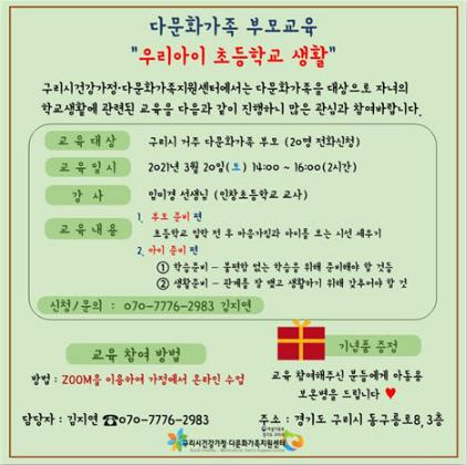 첫 번째 교육은 ‘우리아이 초등학교 생활’로 구리시 인창초등학교 교사인 임미경 선생님을 강사로 초청하여 지역 환경적 특성을 고려한 자녀의 원만한 학교생활 부모 교육과 질문‧응답으로 진행된다.