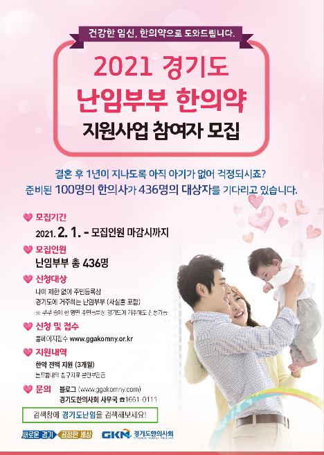 지원은 주민등록상 경기도에 거주하는 난임부부(사실혼 포함)로 부부 중에 한 명만 주민등록상 경기도에 거주해도 신청 가능하다. 지원되는 사업대상자 수는 여성 236명, 남성 200명으로 총 436명이며, 난임진단을 받은 여성을 1차 선정하고 그 배우자의 정액검사결과 WHO 정액검사 4가지 기준 중 1가지 이상 기준치 미달인 경우 2차로 남성을 선정한다. 선정된 여성과 남성 공통으로 3개월간 6회 한약을 무료로 지원하며 침구 치료 시 건강보험이 적용된 본인부담금은 지원에서 제외된다.