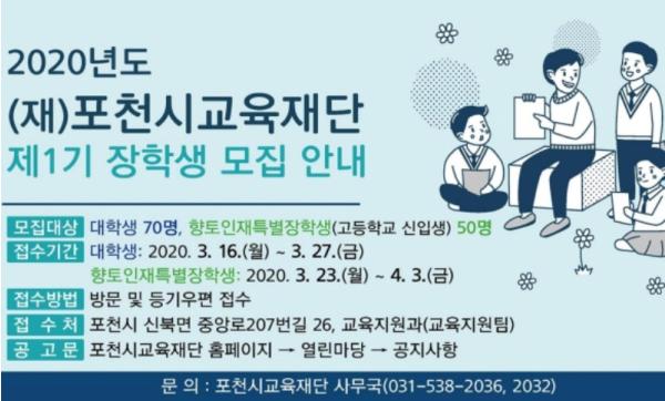 (재)포천시교육재단(이사장 박윤국)은 재능이 우수한 지역 인재를 발굴?육성하고 경제적인 이유로 교육을 받기 곤란한 학생을 지원하는 등 모든 학생들에게 교육 기회를 평등하게 보장하기 위한 장학 사업의 일환으로 2020년도 제1기 장학생을 모집한다고 밝혔다.