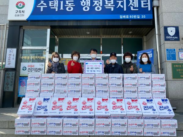 구리시(시장 안승남)는 지난 19일 수택1동 행정복지센터에서 수택1동 나눔 모임, 착한사람(대표 박수근)으로부터 관내 소외계층을 위한 ‘사랑의 라면 100박스’를 전달 받았다.