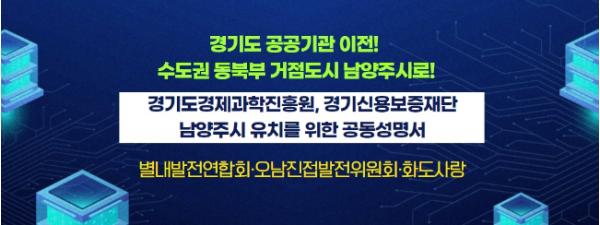 남양주 별내, 진접, 오남, 화도지역을 기반으로 하는 별내발전연합회, 오남진접발전위원회, 화도사랑등 세 단체가 모인것인데, 이들은 경기도경제과학진흥원과 경기신용보증재단 중 한 기관의 남양주 유치를 요구하고 나섰다.