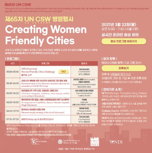 밴쿠버, 바르셀로나, 이라크에서도 지속가능한 성평등 도시의 우수 실천사례를 소개한다. 이번 행사는 실시간 온라인으로 중계되며, 향후 주요행사 개요와 주요 내용을 정리하여 소개할 예정이다.