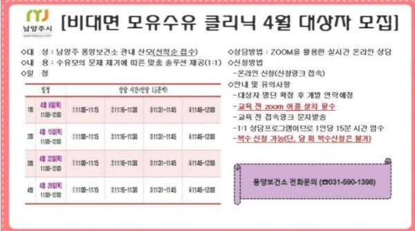 [KNT한국뉴스타임] 남양주풍양보건소는 오는 4월 8일부터 관내 임산부를 대상으로 온라인 화상회의 프로그램을 활용한 1:1 모유 수유 클리닉을 운영한다.