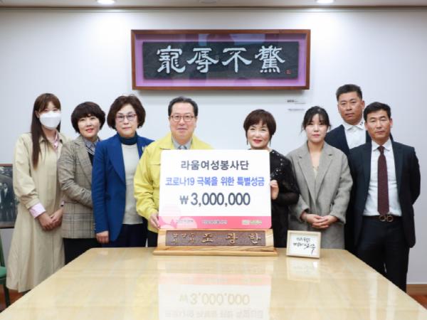 강덕인 회장는 “이번 성금이 코로나19로 인해 힘겨운 시기를 겪고 있는 시민들께 조금이나마 도움이 되었으면 한다.”며 “코로나19 사태가 빨리 종결될 수 있도록 라움 봉사단체 회원들이 나눔 활동에 앞장서겠다.”고 전했다.