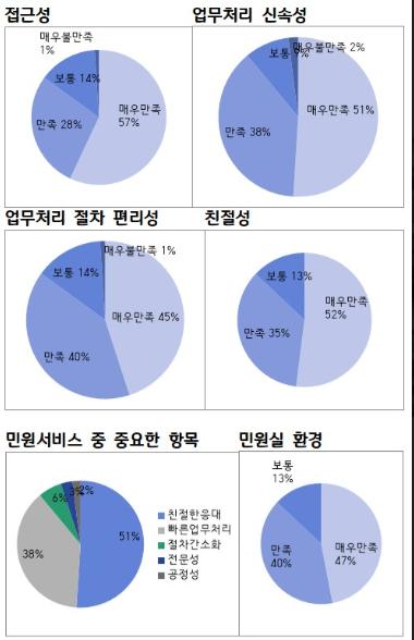 민원서비스 중 가장 중요하게 생각하는 항목이 무엇이냐는 설문에는 친절한 응대가 51%, 빠른 업무처리가 38%로 민원인들은 친절하고 신속하게 민원처리가 이루어져야한다고 응답했다.
