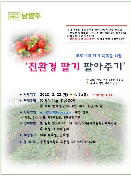 남양주시(시장 조광한)는 지난 9일부터 코로나19 극복을 위한 ‘친환경 딸기 팔아주기’운동을 추진하고 있다.