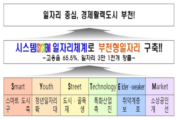 SYSTEM 일자리란 ▲‘Smart’스마트도시 구축 ▲‘Youth’청년일자리 확대 ▲‘Street’도시·골목재생 ▲‘Technology’특화산업 촉진 ▲‘Elder & weaker’취약계층 보호 ▲‘Market’소상공인 개선을 뜻하는 ‘부천형 일자리’를 뜻한다.
