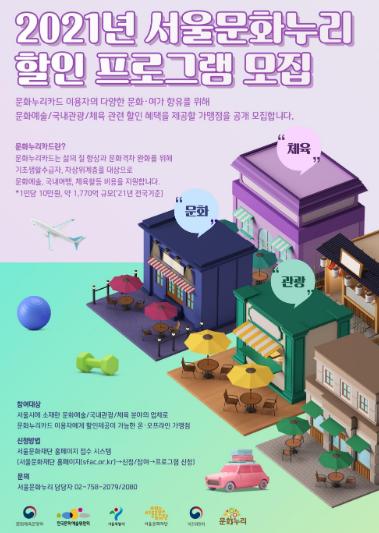 한편 서울문화재단은 서울문화누리 이용자의 더욱 다양한 문화경험을 위해 ‘서울문화누리 할인 프로그램’에 함께할 기업과 가맹점을 상시 모집하고 있다. 온라인, 미술, 공연, 관광 분야 등 참여를 희망하는 가맹점은 올해 11월 30일(화)까지 서울문화재단 누리집을 통해 신청하면 된다.