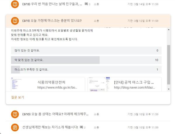 최근 감염병 사태로 인해 학교 휴업이 장기화하면서 수업 시수가 감축되고, 이에 따라 학습 결손의 우려가 가중되고 있는 가운데 이 학교는 온라인 학급방을 개설하여 학생들이 가정에서 시간표에 따라 과목별로 학습 활동에 참여하도록 하고 있다.