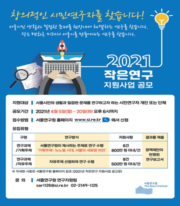[KNT한국뉴스타임] 서울특별시 서울연구원은 4월 5일(월)부터 2021년 「작은연구」지원사업 공모를 진행한다.