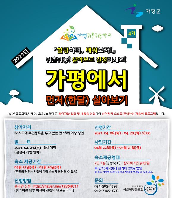사회적협동조합 공감21 부설 가평귀촌귀농학교는 ‘2021년 제4기 가평에서 먼저(한 달) 살아보기’ 참여자를 모집한다.