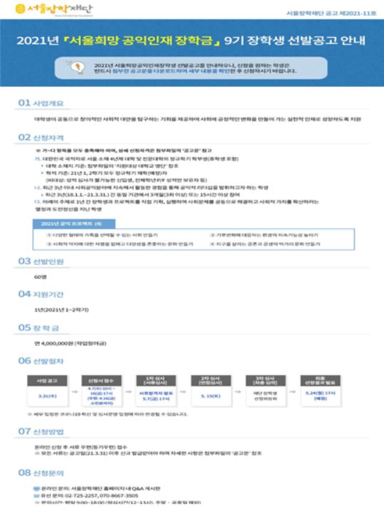 신청 대상은 서울 소재 4년제 대학이나 전문대학의 정규학기 학부생 중 최근 3년 이내 사회·공익분야 활동 경험이 있는 학생으로 휴학생도 신청 가능하다.