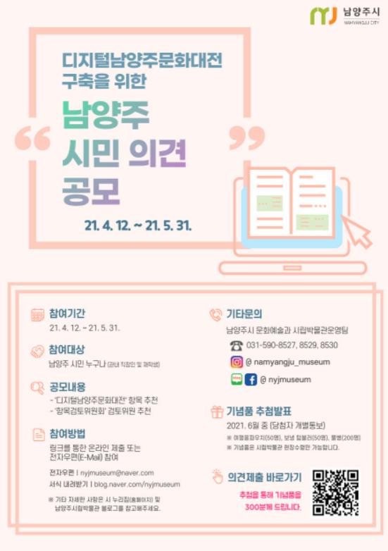 [KNT한국뉴스타임] 남양주시는 4월 12일부터 5월 31일까지‘디지털남양주문화대전’구축을 위한 시민 의견 공모를 진행한다고 밝혔다.