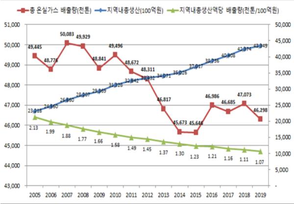 지역내총생산(GRDP)당 배출량은 1백억 원당 1.07천 톤으로, 2005년 이후 지속적으로 감소하고 있는 것으로 나타났다. 특히 2005년 이후 지역내총생산은 갈수록 증가추세를 보이는 반면, 서울시 온실가스 배출량은 갈수록 감소 추세를 보이고 있다.