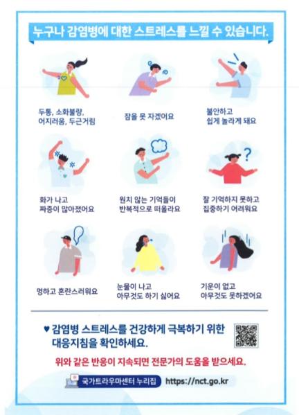 최애경 보건소장은“감염병 유행 시에는 누구나 불안과 스트레스를 느낄 수 있고, 이러한 반응은 자연스럽고 정상적이므로 두려워하거나 감출 필요가 없고. 대부분 증상들은 시간이 지날수록 점차 감소하지만 그럼에도 불구하고 심한 스트레스가 지속된다면 혼자 어려움을 겪지 말고 구리시정신건강복지센터로 연락해 심리 상담을 받으시길 당부드린다”고 전했다.