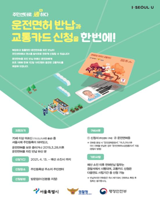 서울시는 「고령 운전자 면허 자진반납 원스톱서비스」를 통해 어르신들의 면허 반납과 교통카드 수령 과정을 더욱 편리하게 지원하고 있다. 면허 반납을 원하는 어르신은 경찰관서의 방문 없이 주민센터에서 반납 신청부터 교통카드 수령까지 한 번에 가능하다.