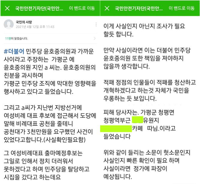 게재된 내용은 “더불어민주당 윤호중 의원과 가까운 사이라고 주장하는 가평군에 윤호중 의원 지인 A씨는 윤호중 의원의 친분을 과시하며 가평군 민주당 조직에 막대한 영향력을 행사하고 있다고 들었습니다. 그리고 A씨가 지난번 지방선거에 여성비례 대표 후보에 접근해서 도당에 말해 비례대표 공천을 줄 테니 공천 대가 3천만원을 요구했던 사건이 있었다고 합니다. (사실확인 필요함)”라고 전했다.