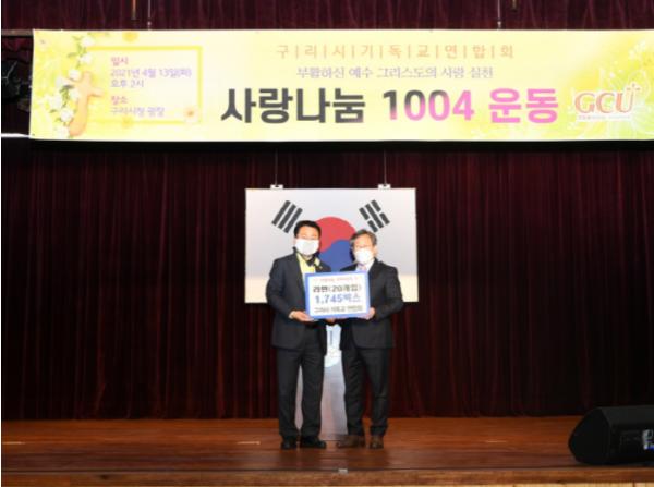 이번 전달식은 구리시 기독교 연합회에서 올해 부활절을 맞이하여 코로나19로 인해 어려운 시기를 보내고 있는 관내 어려운 이웃에게 한 줄기 희망이 되고자 하는‘사랑나눔 1004 운동’행사를 진행하며 마련됐다.
