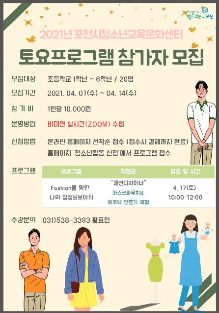 [KNT한국뉴스타임] 포천시 청소년교육문화센터는 관내 청소년들을 대상으로 비대면 진로직업체험 토요프로그램인 ‘패션디자이너 직업체험’ 참가 청소년을 모집한다.