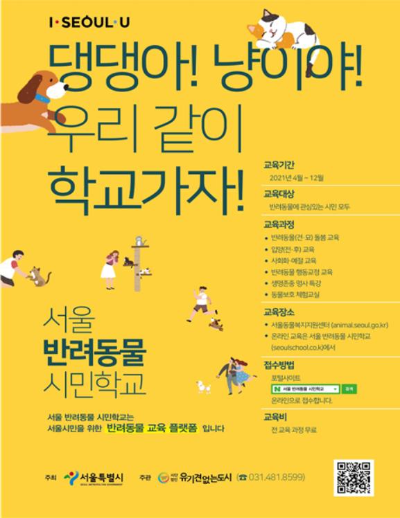 ‘서울시 반려동물 시민학교’ 홈페이지에서 신청하면 누구나 온라인 통합 교육을 받을 수 있다. 반려생활에 필요한 다양한 지식·정보를 얻고 소통할 수 있는 있도록 운영할 예정이다.