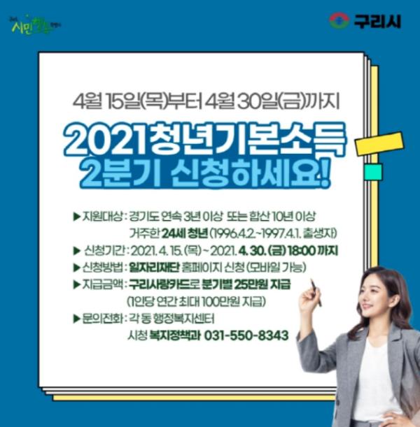 [KNT한국뉴스타임] 구리시는 15일부터 30일까지 2021년 2분기 청년기본소득 신청을 온라인 또는 모바일로 접수한다.