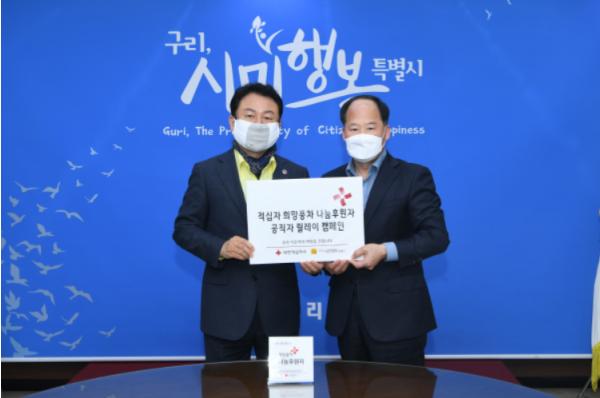 [KNT한국뉴스타임] 구리시는 14일 시청 민원상담실(3층)에서 안승남 시장, 대한적십자사 구리지구협의회 권임순 회장, 대한적십자사 경기도지사 함정현 사업국장 등이 참석한 가운데 대한적십자사가 추진하는‘희망 풍차 나눔 후원’을 전국 지자체 최초로 공직자 대상 릴레이 캠페인을 시작했다고 밝혔다.