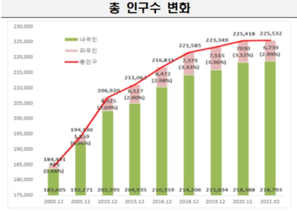 시 발표에 따르면 이천시는 매년 인구가 소폭 증가하고 있으며 지난해 통계청 발표에 따르면 ▸총인구 2000년 184,491명에서 2020년 225,013명으로 21.9% 증가하였다고 한다. 그러나 ▸유소년인구(0~14세)는 2000년 44,451명→2020년 30,282명 ▸실질적 출산여성인구(20~39세) 2000년 33,547명→2020년 27,183명으로 감소하는 추세라고 한다.