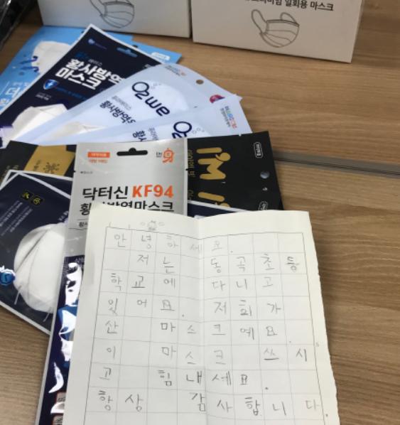 엄마 손을 잡고 파출소를 방문한 한 초등학생은 “안녕하세요. 저는 동곡초등학교에 다니고 있어요. 저희가 산 마스크예요. 이 마스크 쓰시고 힘내세요. 항상 감사합니다.”라며 직접 쓴 편지와 그동안 모은 일회용 마스크 10매를 기부했다.