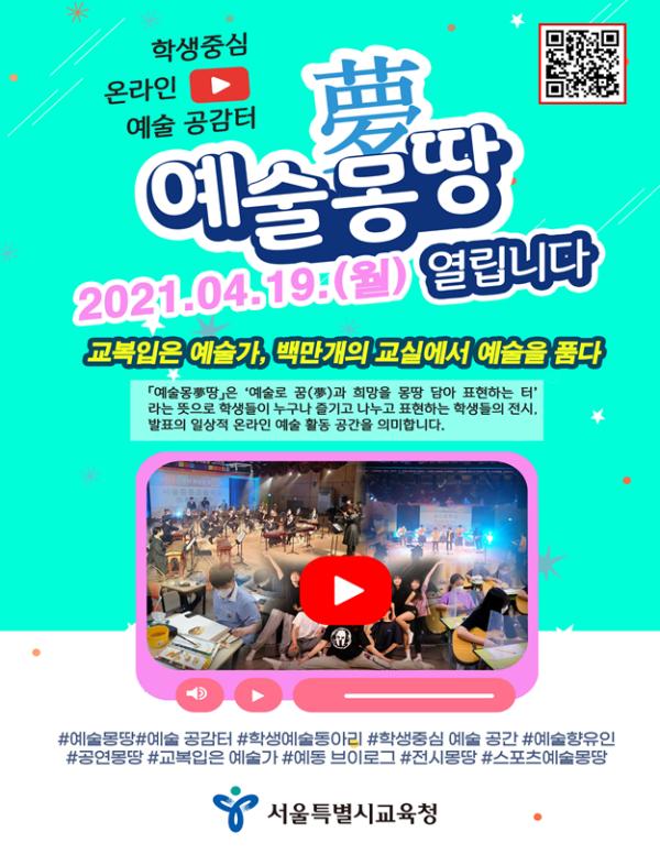 [KNT한국뉴스타임] 서울특별시교육청은 서울 학생 예술동아리 발표 기회를 제공하고 일상 속 예술 향유를 위하여 4월 19일부터 유튜브 채널‘예술몽夢땅’을 개설하여 운영한다. 서울시교육청은‘교복입은 예술가! 백 만개의 교실에서 예술을 품다’라는 구호를 표방하며 보편 교육으로서의 학교 예술교육을 지원한다.