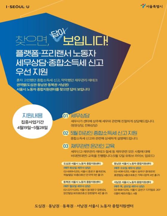 [KNT한국뉴스타임] 서울특별시가 세금신고에 어려움을 겪고 있는 플랫폼·프리랜서노동자를 위해 종합소득세 신고방법을 비롯한 각종 세무 상담을 시작한다고 밝혔다. 세무사가 노동자에게 직접 종합소득세 신고 대상 여부, 신고에 필요한 서류, 신고 방법과 세금 납부요령, 절세방법, 공제기준 등을 자세하게 알려준다.