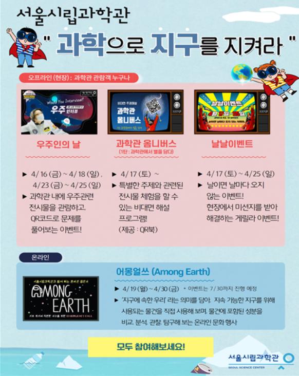[KNT한국뉴스타임] 서울시립과학관은 과학의 날과 지구의 날을 맞아 과학으로 지구를 지킬 수 있는 방법을 고민해 볼 수 있는 다채로운 과학문화 행사를 온‧오프라인으로 진행한다고 4월 19일 밝혔다.