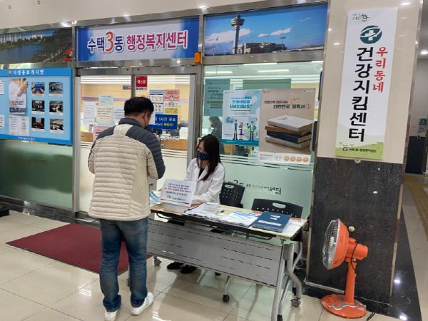 최근 코로나19의 지역사회 전파에 따른 감염증 예방활동의 일환으로, 일반 건강측정·상담뿐만 아니라 각 동을 방문하는 시민대상 코로나19 대응 발열측정 및 감염증 예방생활수칙 교육에도 최선을 다하고 있다.