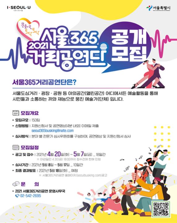 [KNT한국뉴스타임] 서울특별시는 서울의 주요 관광명소, 광장, 시장, 공원 등 야외 열린 공간에서 자유롭게 공연을 선보일 '서울365거리공연단' 150팀을 공개 모집한다.