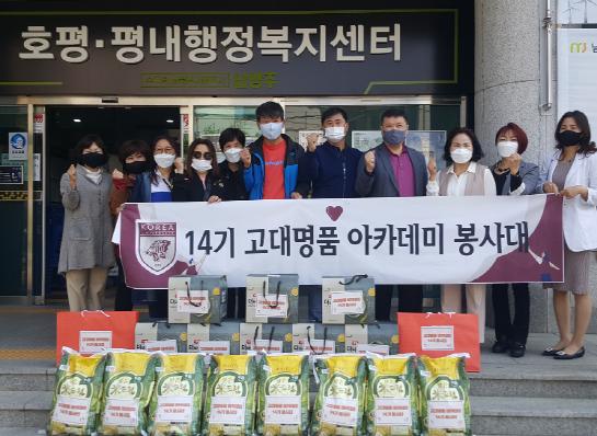 [KNT한국뉴스타임] 호평동 고대명품아카데미 14기 봉사대는 20일 백미 80kg를 호평동과 평내동의 취약계층 8가구에게 각각 10kg씩 전달하며 이웃 사랑을 실천했다.