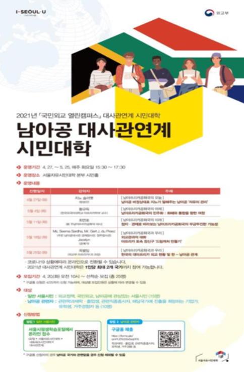 남아공 대사관연계 시민대학 수강신청은 20일부터 서울시평생학습포털을 통해 할 수 있다. 남아공 관련자는 별도의 구글 폼을 통해 접수해야 한다. 신청 링크는 서울시평생학습포털 공지사항에서 확인할 수 있다.