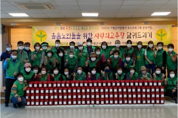 이번 사업은 가평군자원봉사센터 우수프로그램 공모사업으로, 새마을지도자들은 고추장을 담근 후 관내 소외이웃 500가구에 1.5kg 고추장을 전달하였다.
