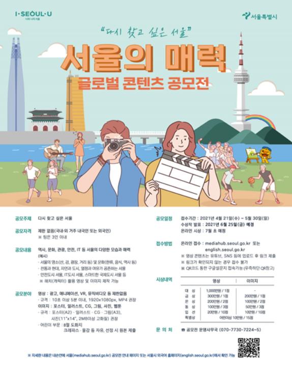 [KNT한국뉴스타임] 서울특별시가 포스트코로나 시대를 대비하고자 ‘다시 찾고 싶은 서울’을 주제로 한 「서울의 매력 글로벌 콘텐츠 공모전」을 개최한다고 밝혔다. 관심 있는 내‧외국인 모두 참여 가능하다.