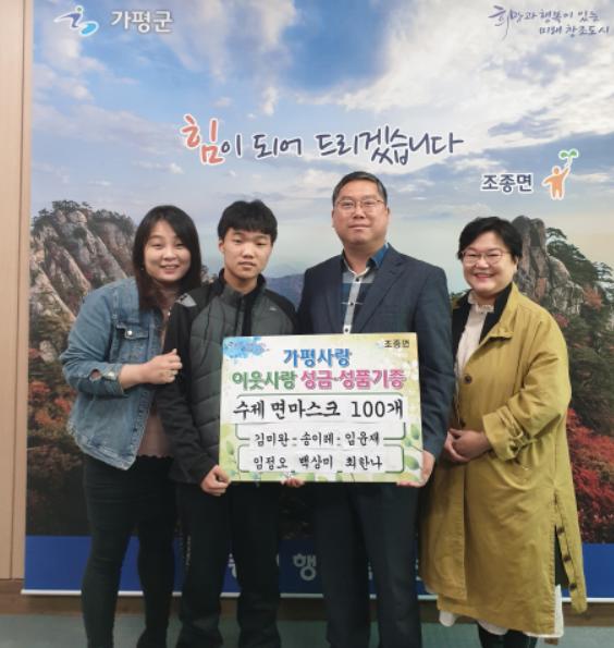 조종면 지역 김미완, 송이레, 임윤재, 임정오, 백상미, 최한나 학생 및 학부모는 직접 만든 면마스크 100개를 면사무소에 기부했다.