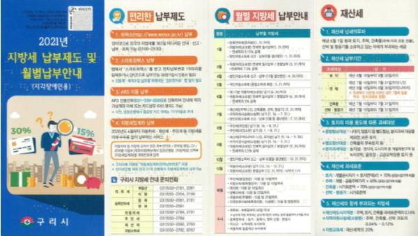 [KNT한국뉴스타임] 구리시는 사회적 약자에 대해 알 권리를 강화하기 위해 시각장애인용 지방세 안내 리플렛 1,000매를 제작하여 각 동 행정복지센터에 배포한다고 22일 밝혔다.