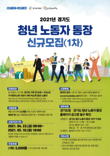 ‘경기도 청년 노동자 통장’은 근로자가 2년간 근로활동을 지속하면서 매달 10만원을 저축하면 만기 시 본인저축액 포함 총 580만원(현금 480만원, 지역화폐 100만원)을 지급받는 사업이다. 단, 2년 동안 경기도에 거주해야 하며, 근무지·근무유형에 상관없이 근로활동 유지, 3회의 금융교육 이수 등 조건을 충족해야 한다.