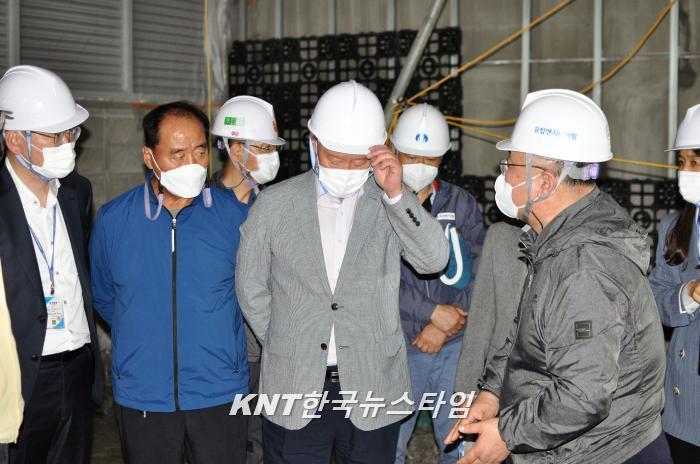 | ( 창업경제타운 지하주차장 공사현장에서 김성기 군수가 임시 집수정을 점검하고 있다. ) |