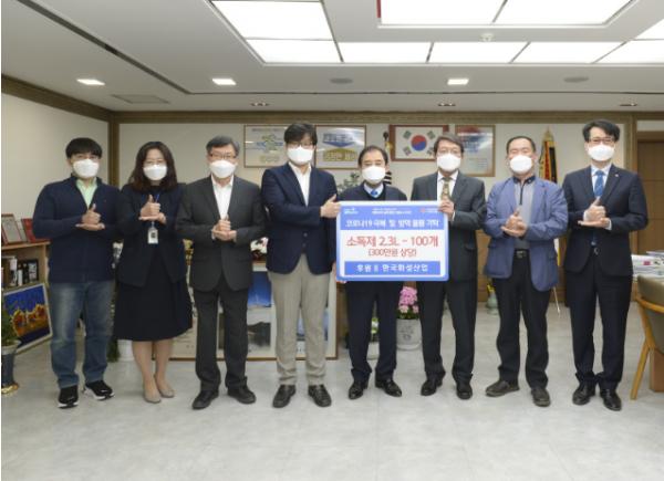 [KNT한국뉴스타임] 포천 선단동 소재의 한국화성산업(대표 최재원)은 지난 22일 코로나19 방역을 위해 300만 원 상당의 소독제를 사회복지공동모금회에 기탁했다.