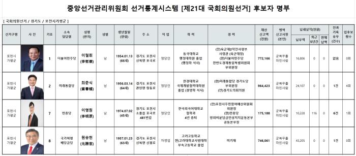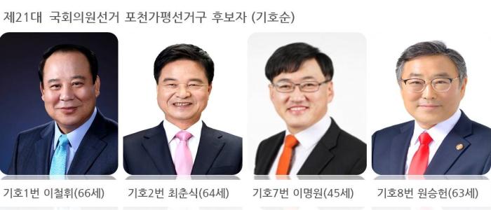 한편 포천시가평군 선거구에는 더불어민주당 이철휘, 미래통합당 최춘식, 민중당 이명원, 국가혁명배금당 원승헌 총 4명의 후보자가 등록하였다.