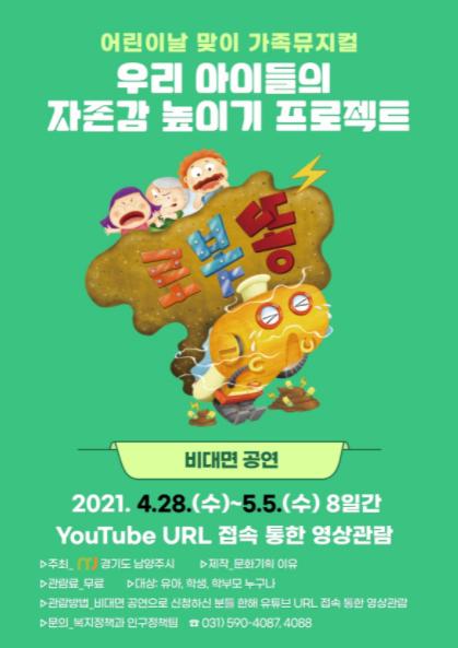 먼저, 시는 5월 가정의 달을 맞아 영유아를 위한 프로그램으로 송경민 작가의 그림 동화를 원작으로 한 가족 뮤지컬 ‘로봇똥’을 준비했으며, 4월 28일부터 5월 5일까지 사전 신청자에 한해 유튜브 URL을 안내하고 비대면으로 상영할 예정이다.