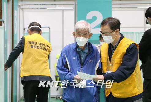가평체육관에 마련된 예방접종센터에서는 대상자 확인-번호표 발행-접수(신분증 확인)-예진표 작성-예진(의사 상담)-예방접종-접종후대기-접종확인서 발급 등의 순서에 따라 접종을 실시하고 있다.