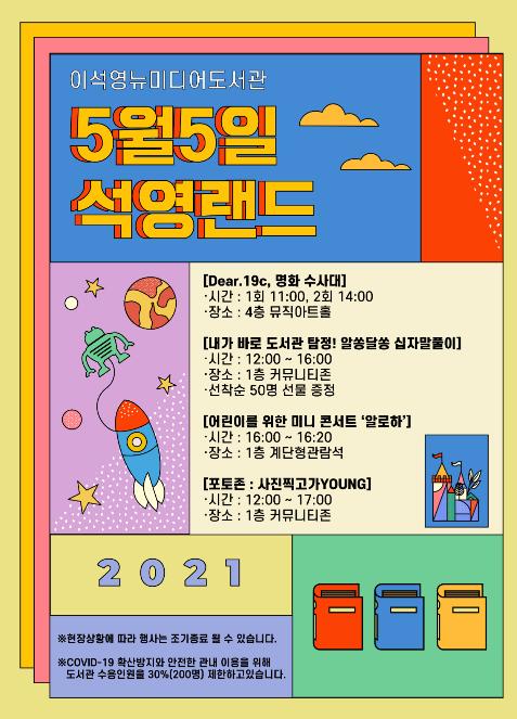 시 관계자는 “어린이날‘석영랜드’행사를 통해 코로나 팬데믹으로 지친 어린이들이 이석영뉴미디어도서관에서 힐링의 시간을 갖길 기대한다.”며, “안전한 행사 진행을 위해 행사전 휴관일에 도서관 시설 전체를 소독하고, 행사 당일 참여자에 대한 방역지침을 철저히 준수하여 운영할 예정”이라고 덧붙였다.