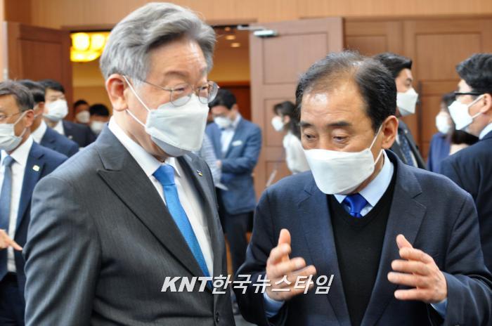 | ( 박윤국 포천시장과 이재명 경기도지사가 회의직후 긴밀한 대화를 나누고 있다. ) |