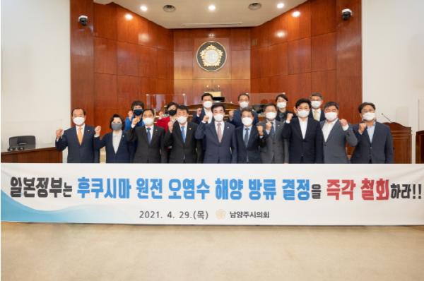 남양주시의회는 결의안에서 일본 정부의 후쿠시마 원전 오염수 해양방류 결정을 규탄하며 즉각 철회할 것과 오염수 현황, 재처리 방법에 관한 모든 정보를 국제사회에 투명하게 공개할 것을 촉구하는 한편 우리정부에도 일본의 원전 오염수 해양방류 시도에 대해 면밀히 점검하고 단호하고 실효성 있는 대책을 마련할 것을 촉구했다.