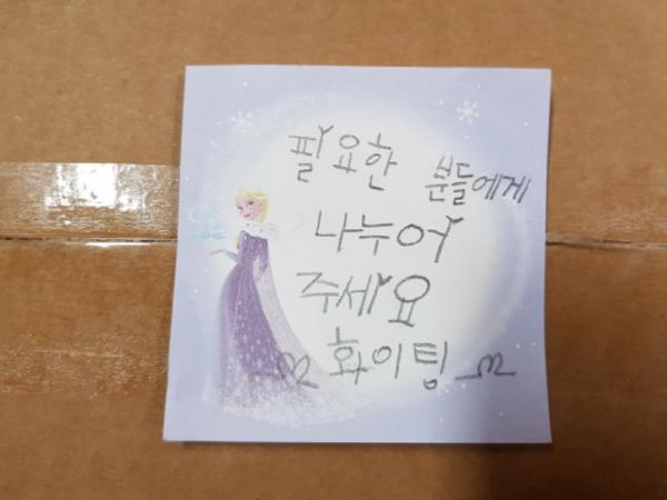 손소독제 상자 안에는 “필요한 분들에게 나누어 주세요. 화이팅”이라는 예쁜 손글씨 쪽지가 함께 들어 있었다.
